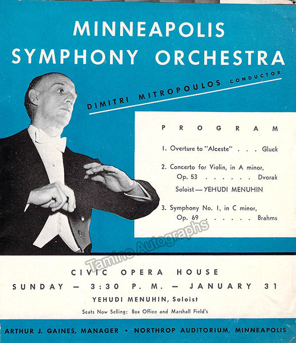 ALSO INCLUDED is a small 4-page program of the Minneapolis Symphony Orchestra for a performance in the 1950s (no year indicated) conducted by him.  Size is 6 x 6.75 inches, in excellent condition.