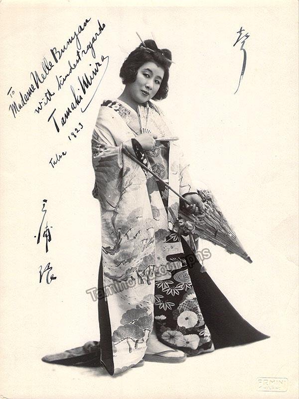 Japanese soprano (1884-1946), very attractive signed photograph, shown in the title role of Puccini's Madama Butterfly. Inscribed, signed in Tulsa, Oklahoma, dated in 1923. Clear and bold handwriting and signature. Blind stamped by photographer Ermini, Milan. Size is 7 x 9.5 inches, in excellent condition.