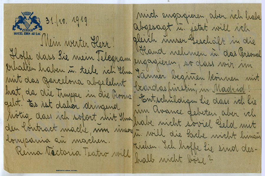”…Hoffe dass Sie mein Telegram erhalten haben u. teile ich Ihnen mit das Barcelona abgelehnt hat, da die Truppe in die Provinz geht. Es ist daher dringend nötig dass ich sofort mit Ihnen den Contract mache, um unsere Compania an machen. Reina Victoria teatro will mich engagieren, aber ich habe abgesagt und jetzt will ich gliech unser Geschäft in die Hand nehmen u. das Personal engagieren, so dass wir im Januar beginen können mit Czardas Fürstin, im Madrid!…”.