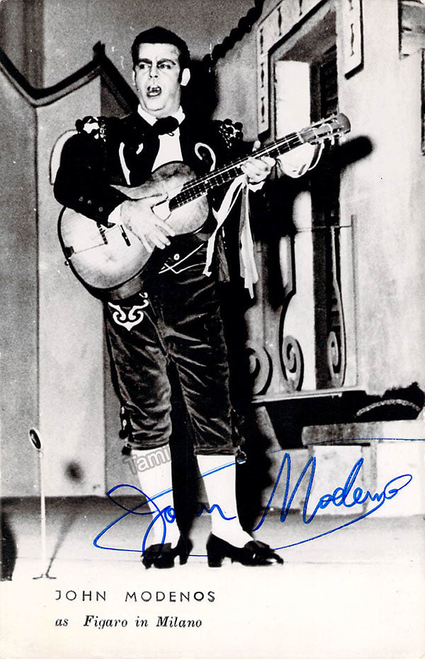 Cypriot baritone (1927-2011), signed postcard photograph, shown as Figaro in Rossini's Barbiere di Siviglia. Size is 3.5 x 5.5 inches, in excellent condition.