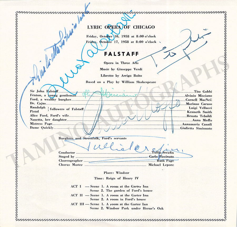 Fantastic clip from a cast page from a program for a performance of Verdi's Fastaff at the Chicago Lyric Opera on October 10 & 17, 1958, featuring Anna Moffo (Nanetta), Tito Gobbi (Falstaff), Renata Tebaldi (Alice), Giulisetta Simionato (Quickly), Alvinio Misciano (Fenton), and conductor Tullio Serafin, and signed by them. Size is 8.2 x 7.8 inches, in excellent condition.