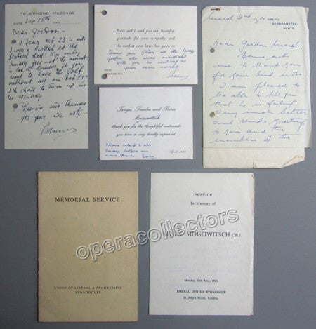 Russian pianist (1890-1963), regarded by a Rachmaninov as his musical heir. Handwritten letter, signed "Benno", about cancelling a meeting because of a recital. As well a printed letter of thanks, signed "Benno", a handwritten and signed letter by Anna Moiseiwitsch of 9 March 1954 and a printed letter of thanks, april 1963, inscribed and signed as "Boris" by Boris Moiseiwitsch. Included are as well two programs of the Memorial Service for Benno Moiseiwitsch
