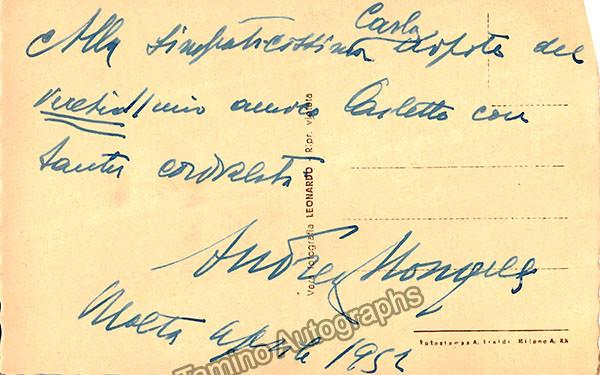 Italian bass (1901-1970), signed photo postcard, shown as himself, signature is on verso, inscribed and dated in 1952 in Malta. Size is 5.5 x 3.5 inches, in excellent condition.