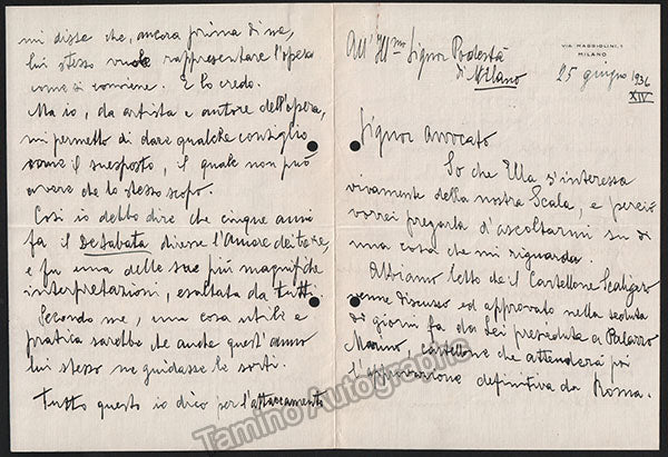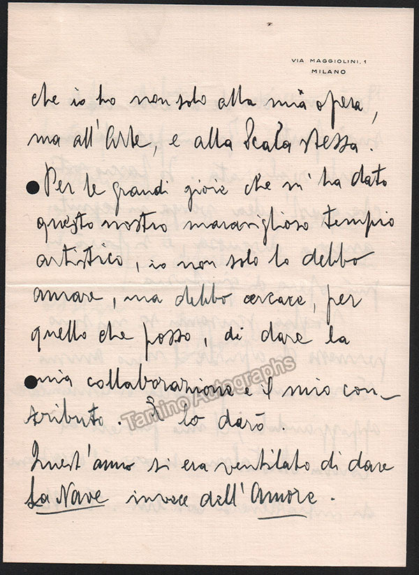 Long autograph letter signed, dated in Milan in 1936, 7 pages, written in Italian, sold untranslated. Size of each page is 6.5 x 9 inches, central fold, in excellent condition. ALSO INCLUDED: an attractive unsigned half-tone photograph of the composer, shown young. Size is 8.5 x 11 inches, in excellent condition. Not sold separately.