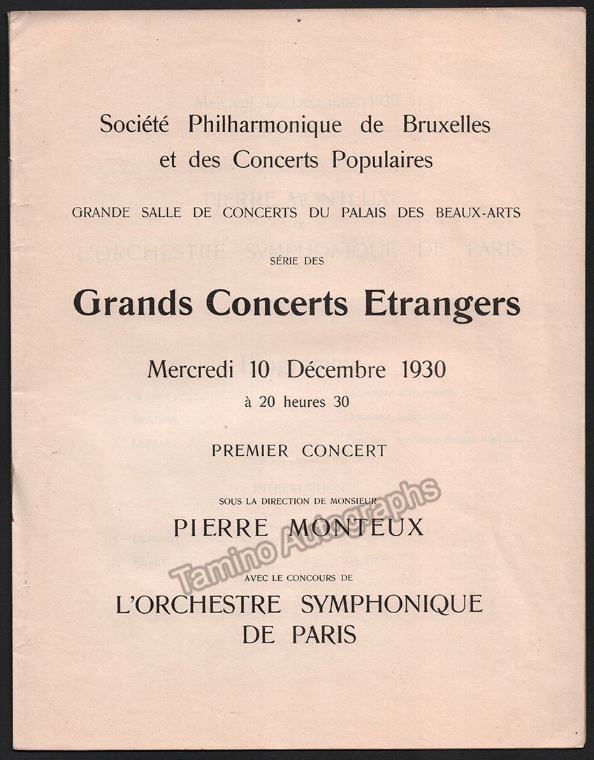 Full program for a concert by the Paris Symphony Orchestra conducted by Pierre Monteux in Brussels, 1930. Size is 8.5 x 10.75 inches, with all pages and covers, some toning on front cover, otherwise in very good condition.