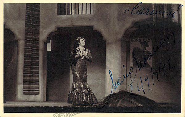 Romanian mezzo-soprano (1913-1985), signed postcard photograph, shown in the title role of Bizet's Carmen, dated in 1942. Size is 3.5 x 5.5 inches, in excellent condition.