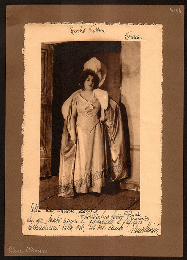 Soprano, most likely of Italian origin, signed photograph, shown in role at the Teatro Rittori, Verona (possibly as Puccini's Tosca), extensively inscribed. This a 7.5 x 11.25 inch photo mounted onto soft cardboard, total item size is 9.5 x 13.5 inches, slight tears on far edges of the photo, otherwise in excellent condition.
