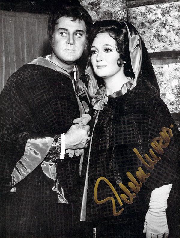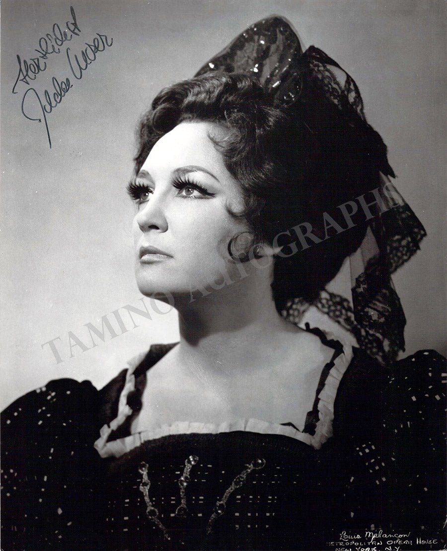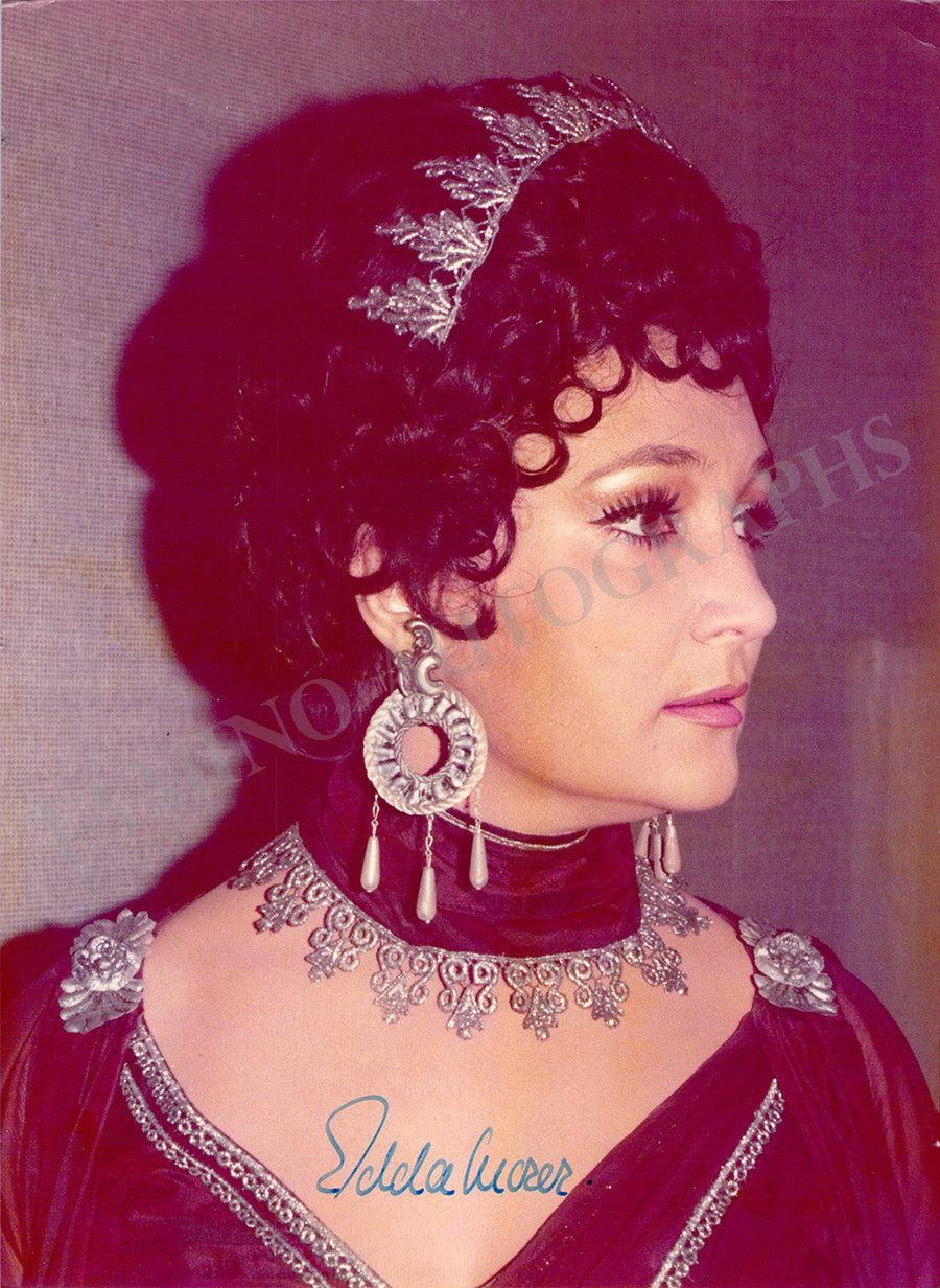 Fine color photograph signed by her, shown backstage probably as Tosca. Size is 7.9 x 10.75 inches, in excellent condition.