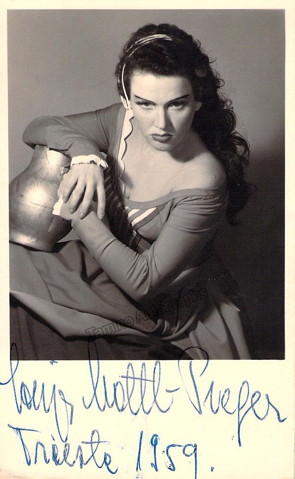 Yugoslav soprano (1923-2014).  Signed postcard photo, shown in role, signed in Trieste, dated in 1959. Stamped on verso by photographer Atelier Dietrich, Vienna. Size is 3.3 x 5.4 inches, in extremely good condition.