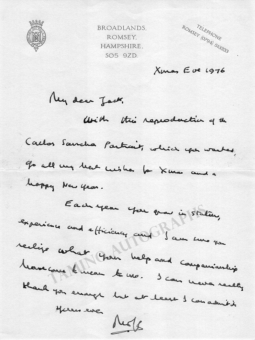 British Royal Navy officer and statesman (1900-1979), Supreme Allied Commander in south-east Asia during World War II, last viceroy of India before independence and the first Governor-General of independent India (1947-1949). Autograph note signed as LMB, dated in 1976, greeting someone for Christmas and sending a gift, one page, 6 x 8 inches, in excellent condition.