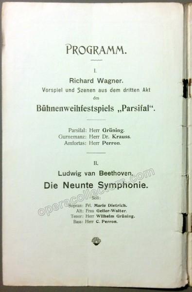 Karl Muck conducts the Berlin Opera Orchestra. March 11, 1901. Wagner Parsifal (3d act) , Beethoven 9th symphony. Soloists: Marie Dietrich, Luise Geller-Wolter, Wilhelm Gruening, Carl Perron. Very good condition, 24 pages, 5 x 7.75 inches