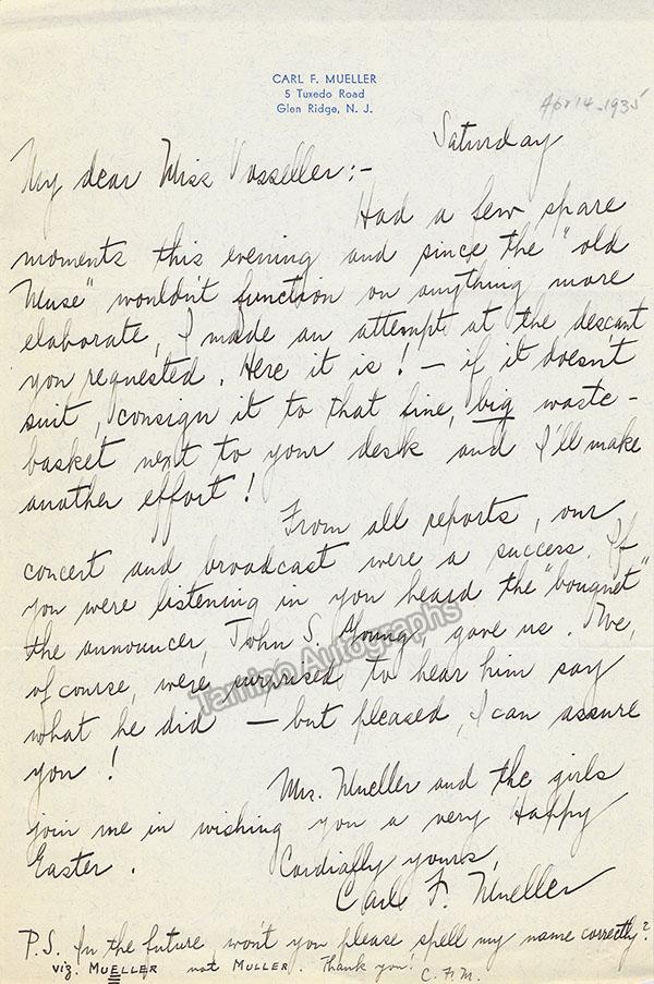 Mueller, Carl F. - Autograph Letter Signed 1935