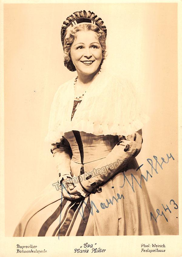 Bohemian soprano (1898-1958), signed photo postcard, shown as Eva in Die Meistersinger at the Bayreuth Festival, dated 1943. Photo by Atelier Weirich, Bayreuth. Size is 4 x 5.75 inches, in excellent condition.