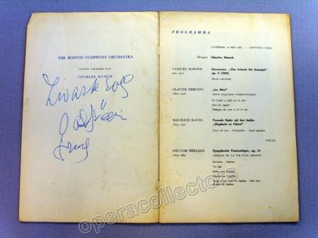Signature and dedication on empty page next to page with program details of program Boston SO. The Hague, 10 May 1952. Barber, Debussy, Ravel, Berlioz Symphonie Fantastique. 24,5 x 16 cm.  Excellent condition.