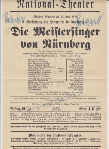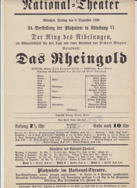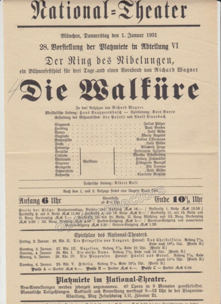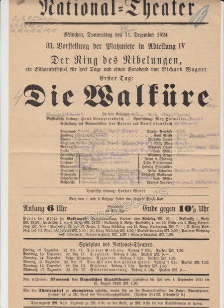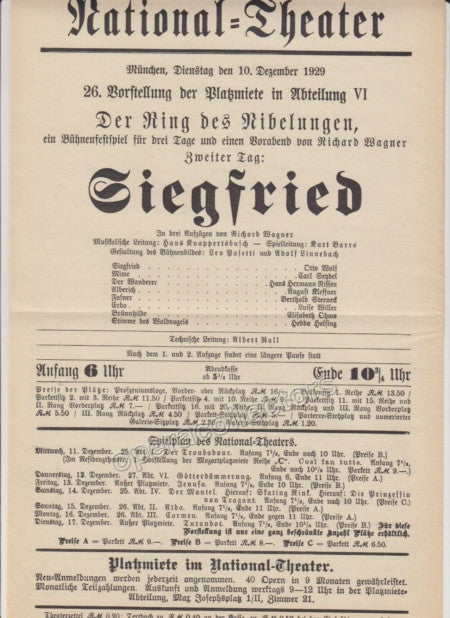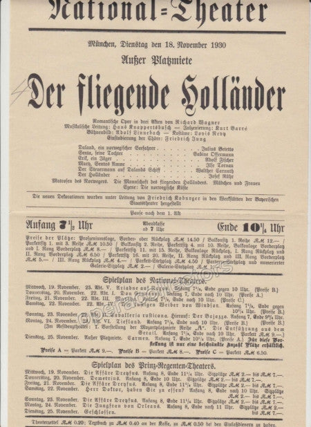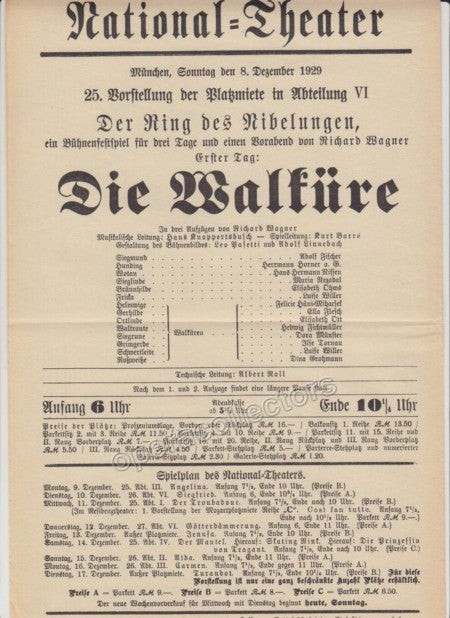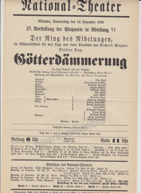 Lot of 8 original playbills from the National Theater in Munich, late 1920s through early 1930s, all with Hans Knappertsbusch conducting, 8.25 x 12.5 inches. Each one is one page, 9 x 11.5 inches - Click on thumbnails to see scans.