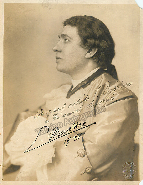 French tenor (1876-1954), signed photo, shown in role. Inscribed and dated in 1921. Size is 7.25 x 9.5 inches. Blind stamp on front by photographer Matzene, Chicago. Damage on two corners and a couple of repaired cracks, priced accordingly.