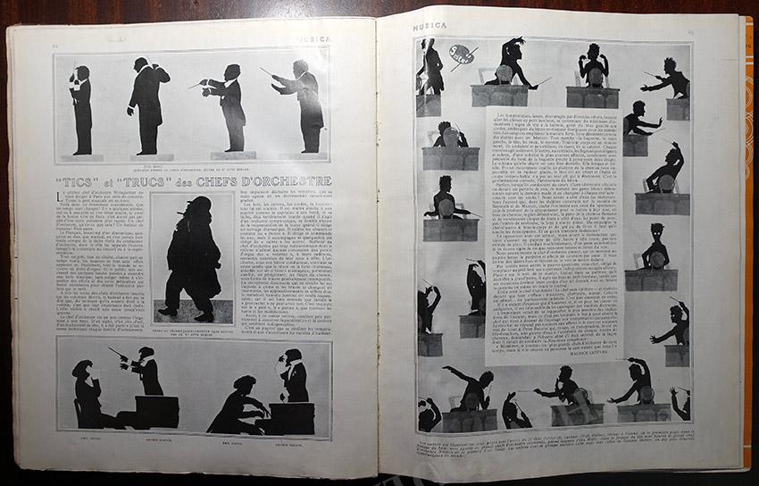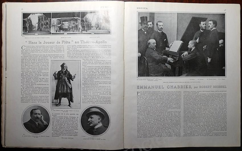 Bound volume with 22 issues of "Musica" Magazine, a monthly French publication, from nr. 81 (June 1909) through 103 (April 1911), all number except nr. 95 that is missing. Hardcovers with ownership name, in very good condition, most have the original covers, minor trimming to bound the volumes, overall size is 11 x 13.5 x 1.25 inches.