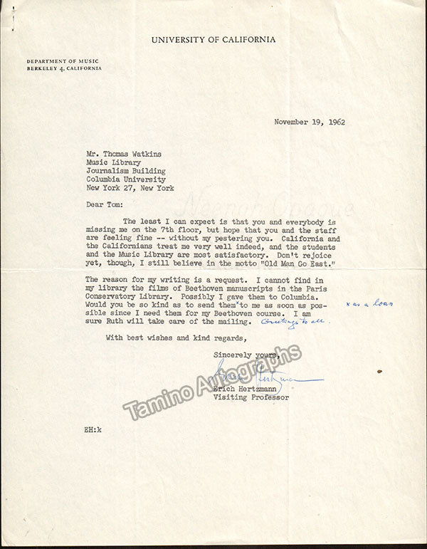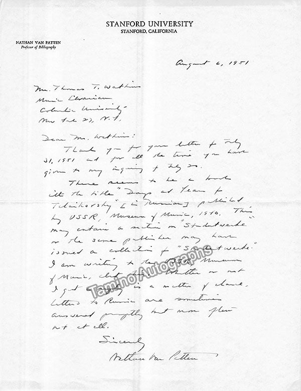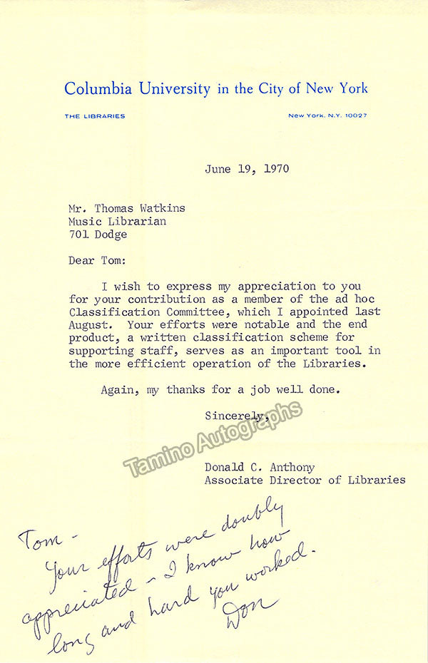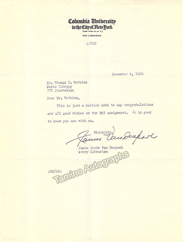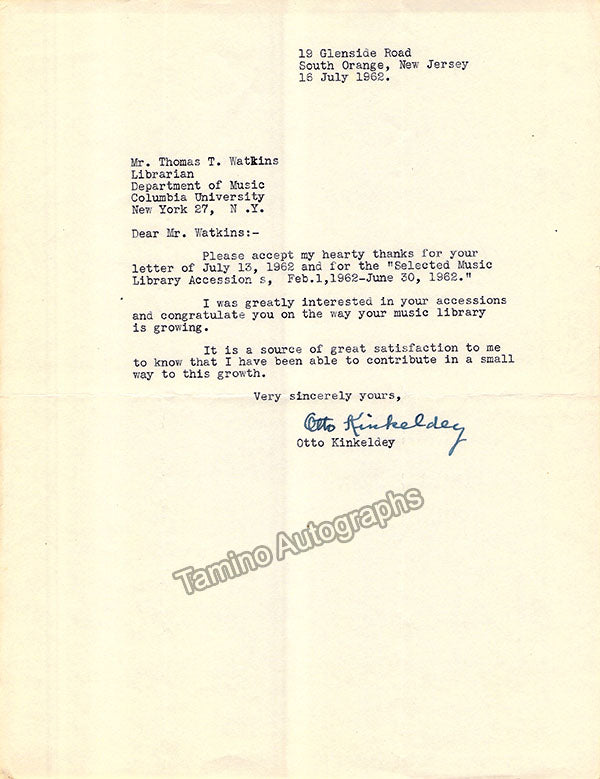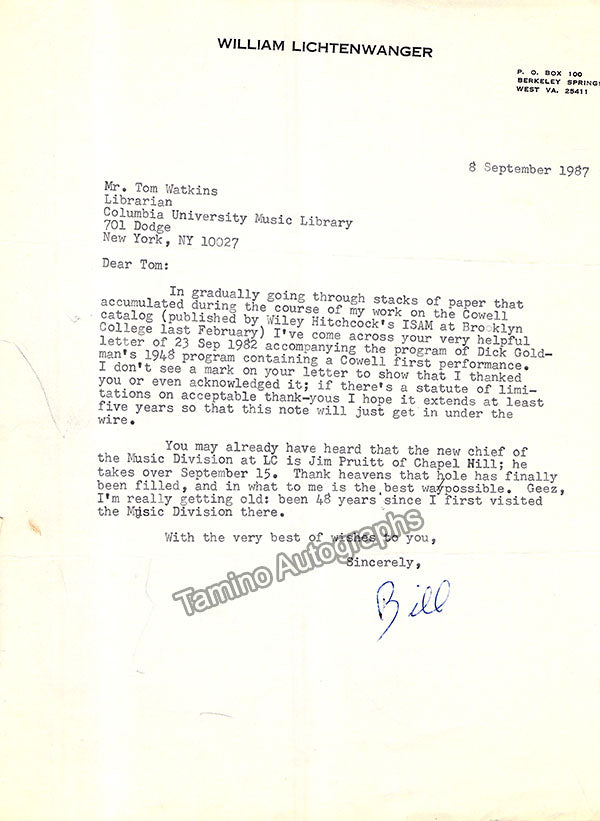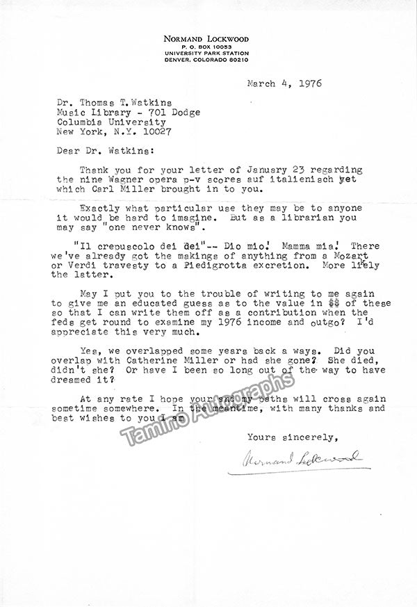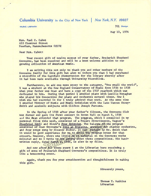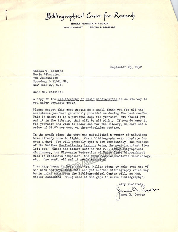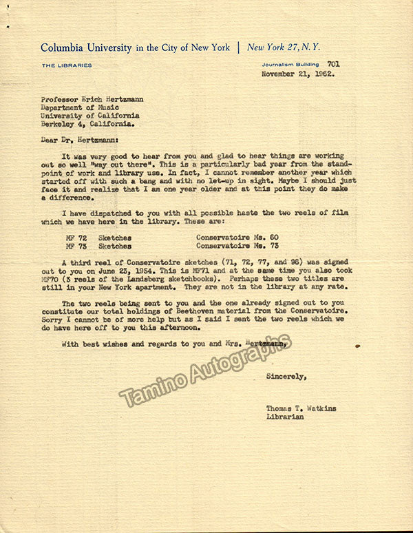 A large consisting of over 70 letters (handwritten and typed), a few clips, received and a few sent by Librarian Thomas T. Watkins (1918-1997), who was Music Librarian at Columbia University in New York for many years.