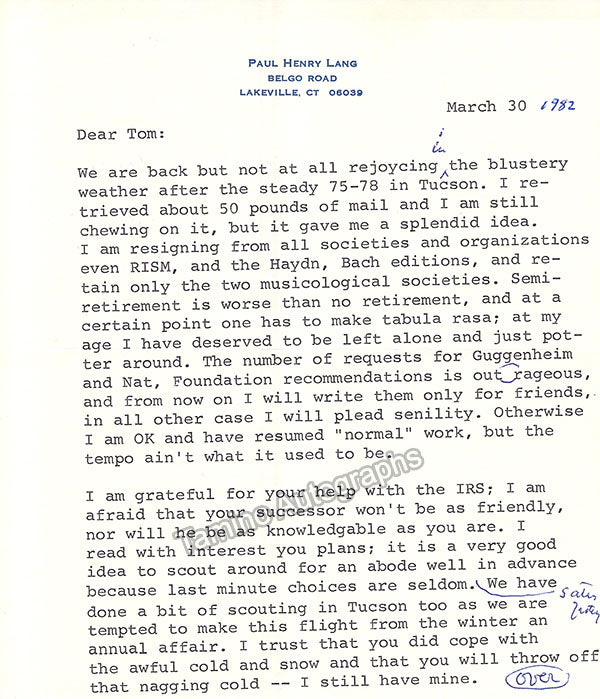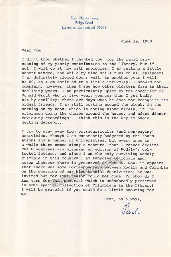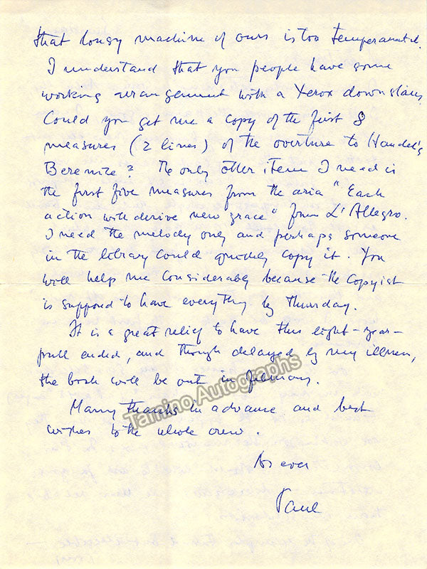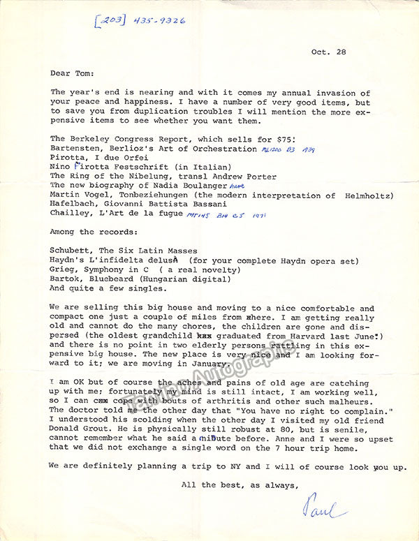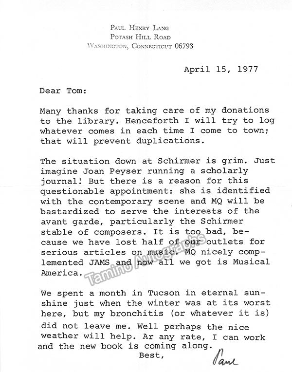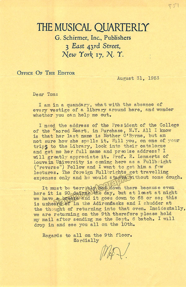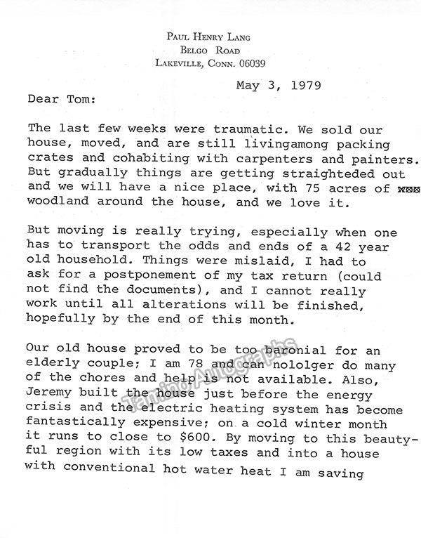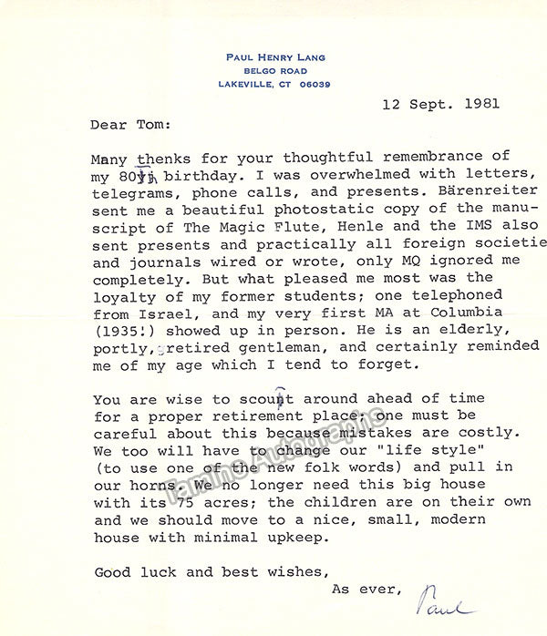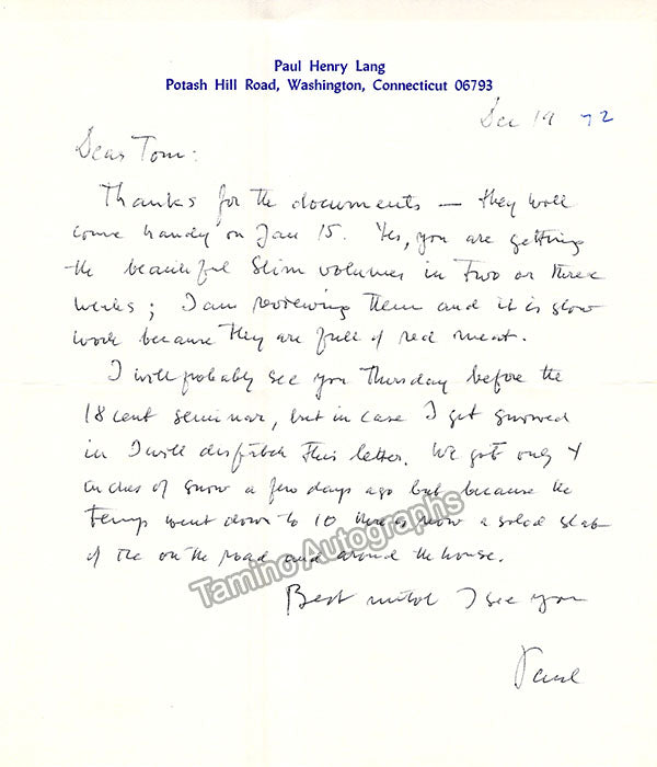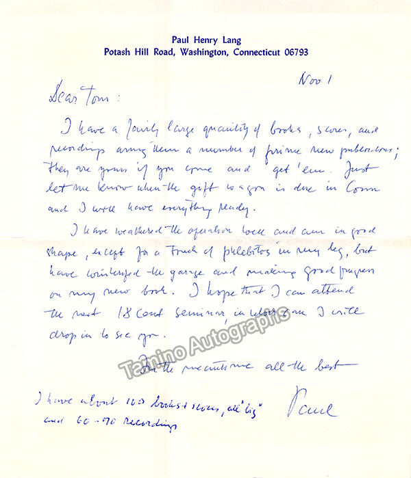 - Several letters (some handwritten, some typed, all signed as "Paul"), by musicologist and music critic Paul Henry Lang (1901-1991).