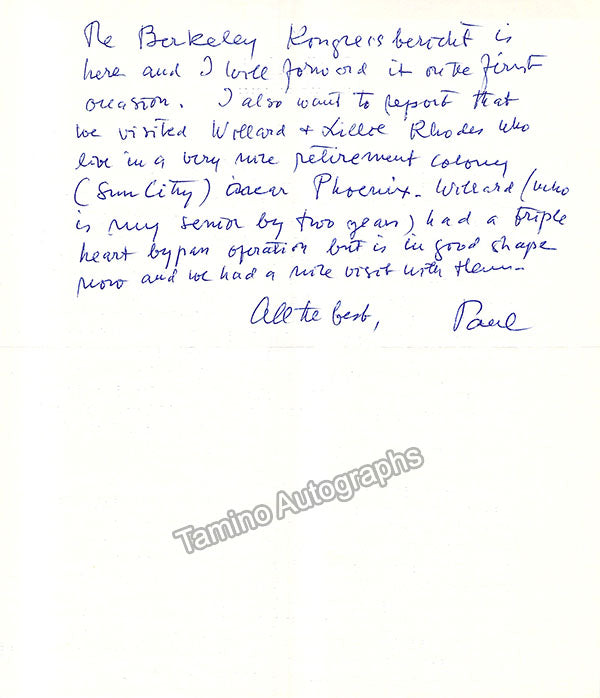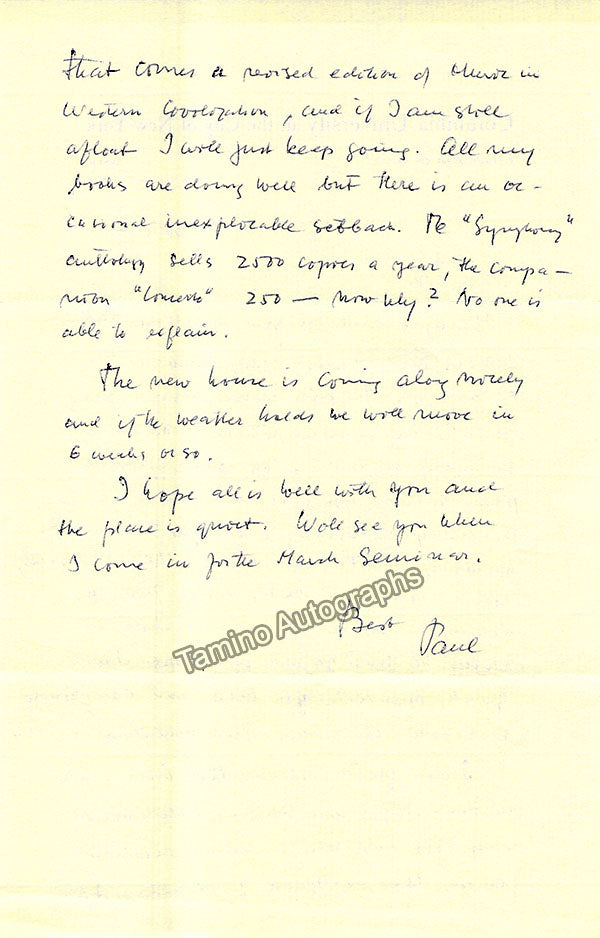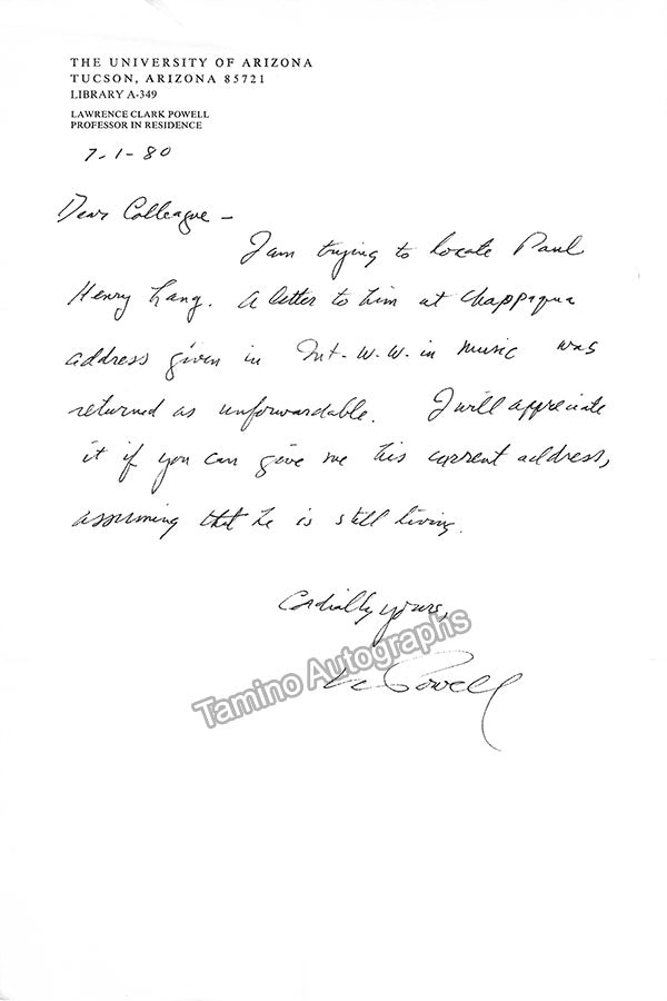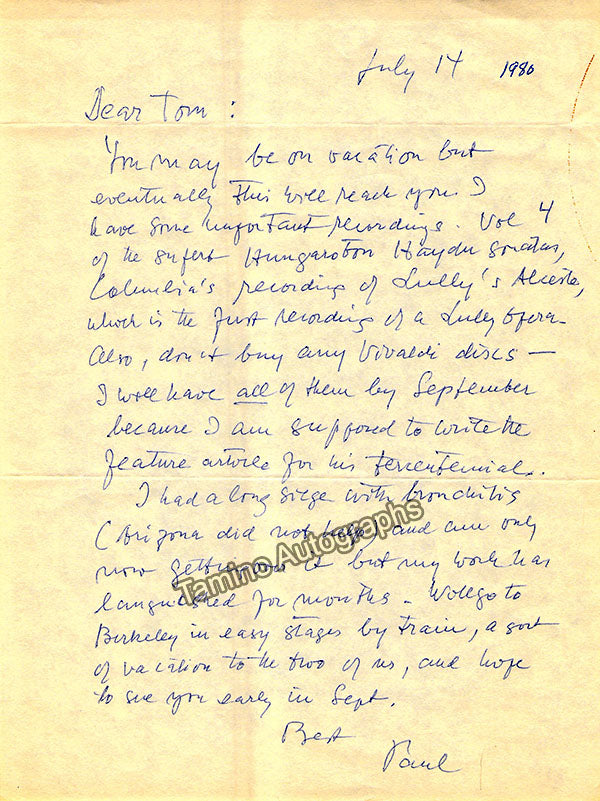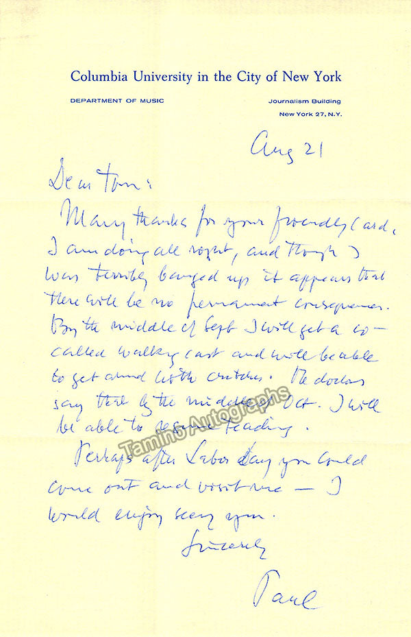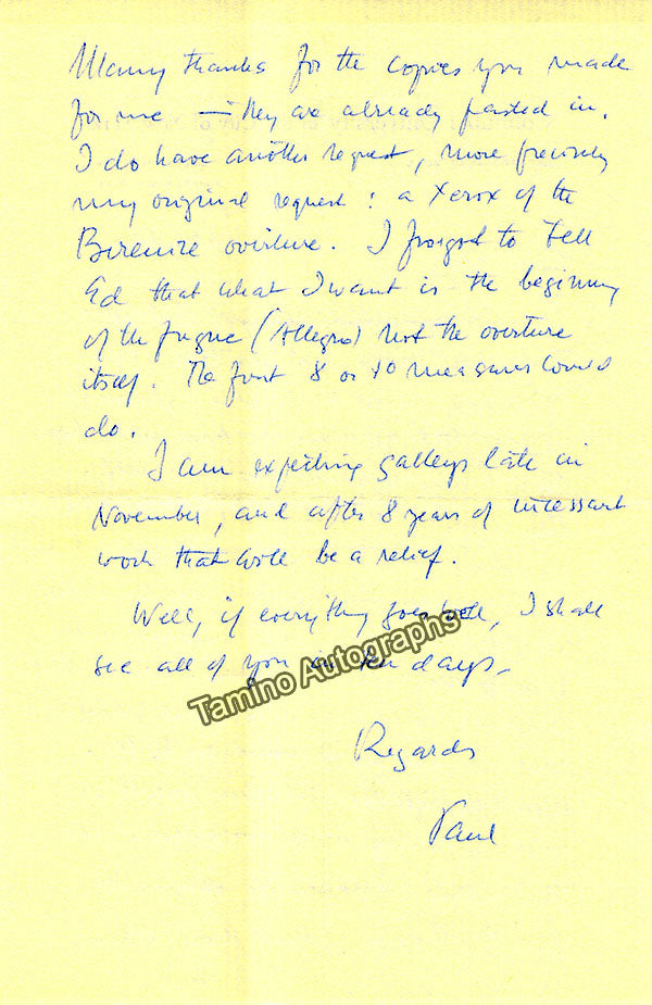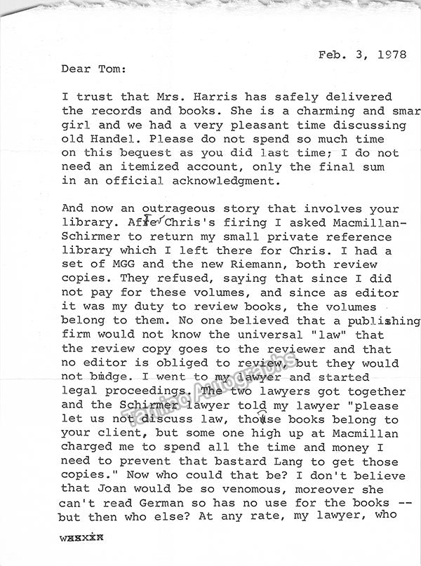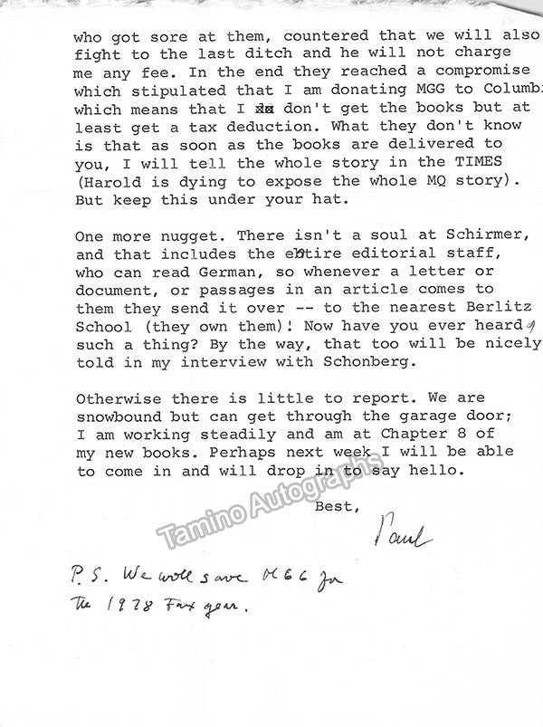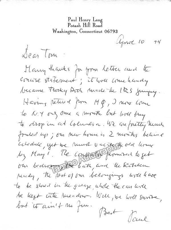 - Several letters (some handwritten, some typed, all signed as "Paul"), by musicologist and music critic Paul Henry Lang (1901-1991).