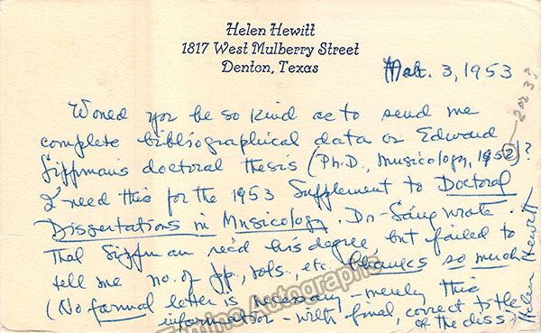 - musicologists Alan Tyson (1926-2000), Richard S. Angell (1905-1985), Denis Stevens (1922-2004), Edward Lowinsky (1908-1985), Jan La Rue (1918-2004), Eric Hertzmann (1902-1963), ethnomusicologists Alan Lomax (1915-2002) and Laura Boulton (1899-1980), music bibliographer Vincent Duckles (1913-1985).