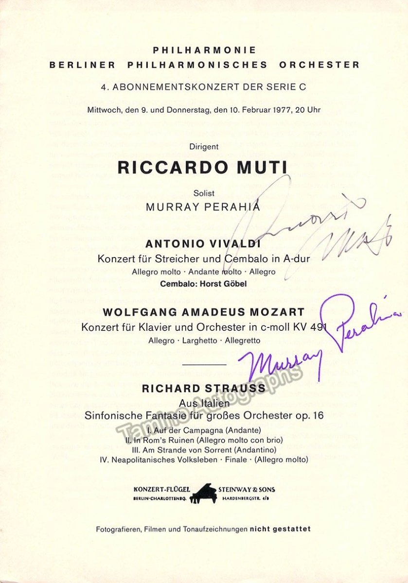 Signatures on program Berlin Philharmonic Orchestra. Berlin, 9/10. February 1977. Vivaldi, Mozart Piano Concerto KV 491, R. Strauss. 24 x 16.5 cm, 4 pages, folder.
