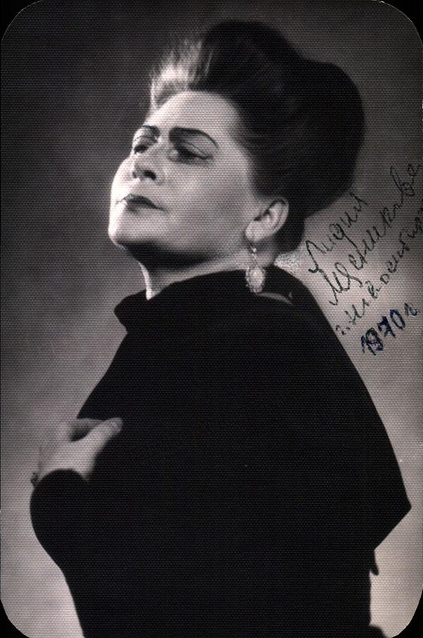 Russian mezzo-soprano (1911-?), signed photo, shown in role, dated in 1970. Size is 3.5 x 5.5 inches. Rounded corners, otherwise in excellent condition.