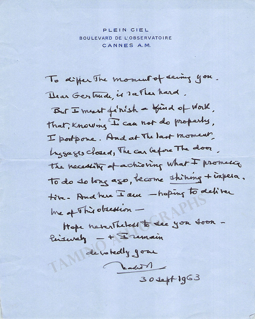 Autograph letter in French (sold untranslated) to an unknown recipient, signed by her on May 13, 1940. Size is 8.25 x 10.75 inches, 1 written page, central fold, in very good condition.