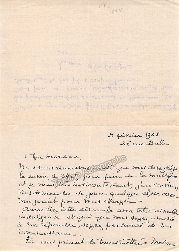 Set of 2 autograph letters in French signed by her, one of them dated in 1908. Sizes are 4.3 x 5.6 inches (open) and 6.7 x 9.3 inches (open), in very good condition or better.