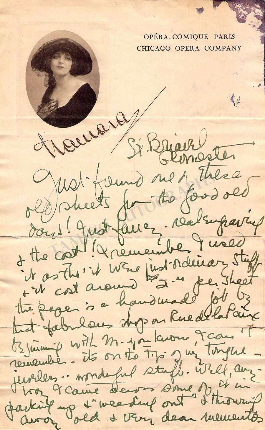 Black-and-white photograph signed and inscribed by her with a short sentiment, shown in the title role of Massenet's opera Thaïs. Size is 6.6 x 8.3 inches, in excellent condition.