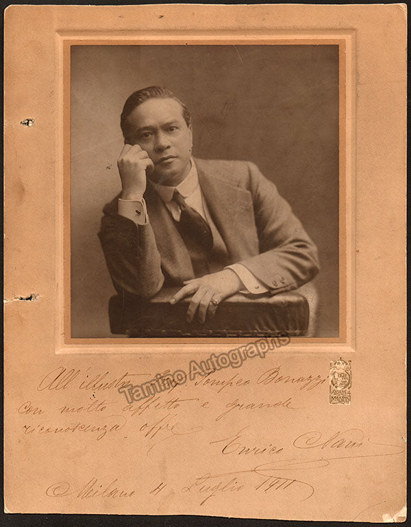 Italian baritone (1873-1940), signed photograph, shown as himself, inscribed in Milan dated in 1911. Bold and clear handwriting and signature. 6.5 x 7 inch photo mounted onto cardboard, all handwriting is on the bottom cardboard, not on the photo itself. total size is 9.5 x 12 inches, some tears and holes on edges of the cardboard not affecting any of the writing or signature, photo itself is in excellent condition.