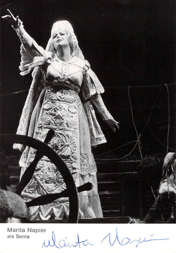 South African soprano (1939-2004), signed photograph, shown as Senta in Wagner's Die Fliegende Hollander. Size is 4 x 5.75 inches, in excellent condition.