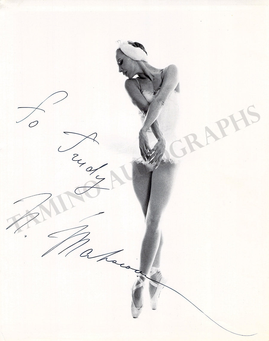 Gorgeous black-and-white photograph signed and inscribed by her, shown in Swan Lake; ink-stamped on verso by Ballet Theatre Foundation. Size is 8 x 10 inches, minor creases, otherwise in very good condition.