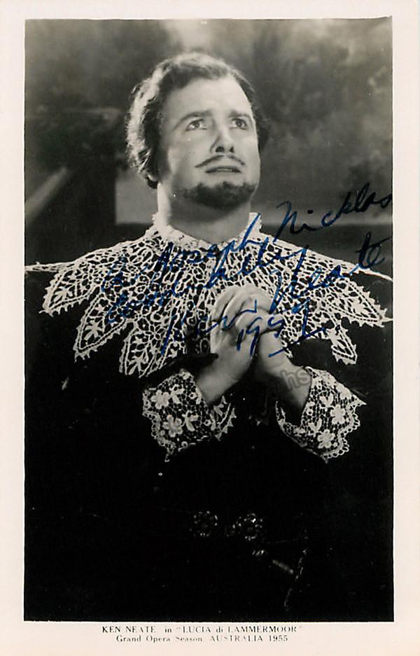 Australian tenor (1914-1997), signed photo postcard, shown in Lucia di Lammermoor. Inscribed and dated in 1959. Size is 3.5 x 5.5 inches.
