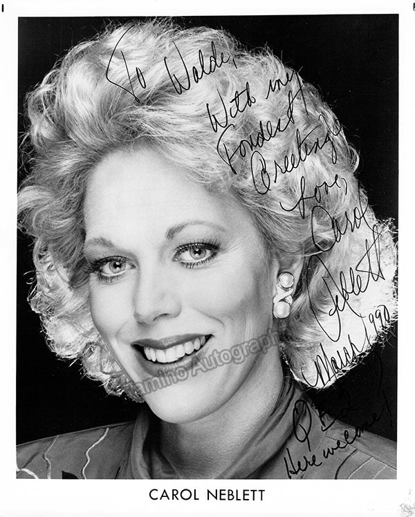 Signed publicity photograph, shown as herself, inscribed with sentiment, dated in 1990. Size is 8 x 10 inches, small creases on bottom left and right, otherwise in excellent condition.