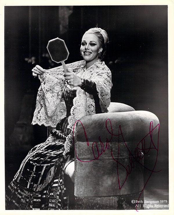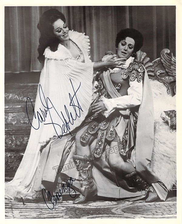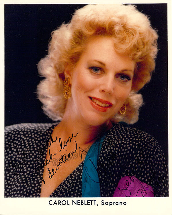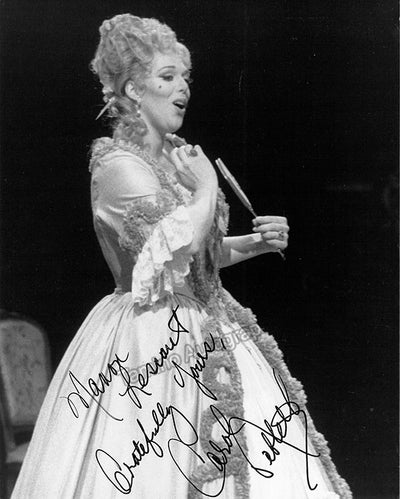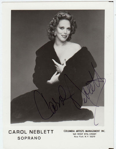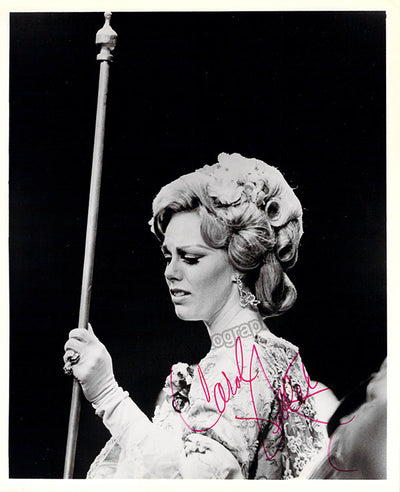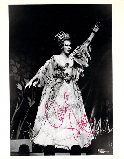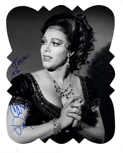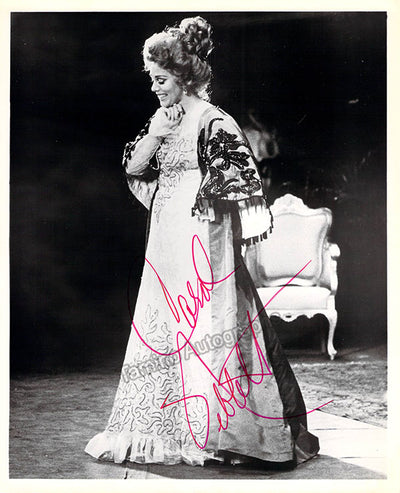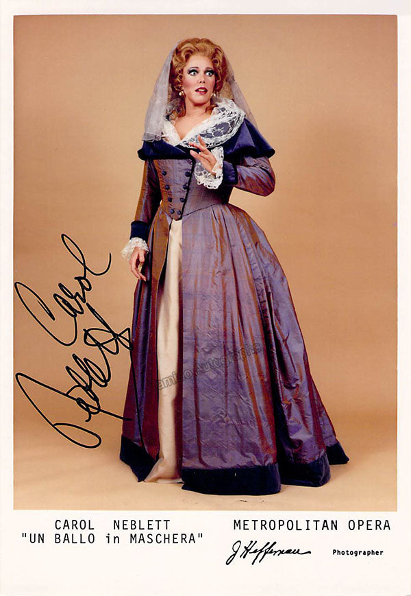 Fine color promo photograph signed by her, shown as Amelia in Verdi's opera Un Ballo in Maschera at The Metropolitan Opera. Size is 5.1 x 7.1 inches, in excellent condition.
