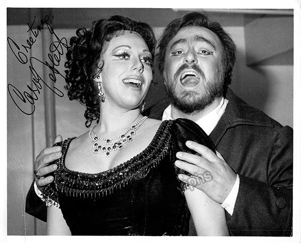 Signed photograph, shown backstage in costume of Puccini's Tosca with Luciano Pavarotti as Cavaradossi. Stamped on verso by photographer David Fishman. Size is 8 x 10 inches, jagged line to left of image and small creases on edges, otherwise in good condition.