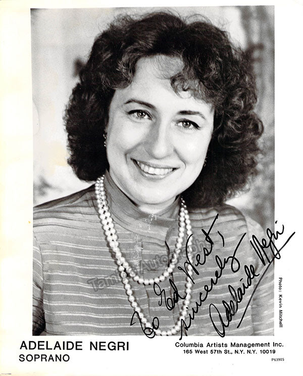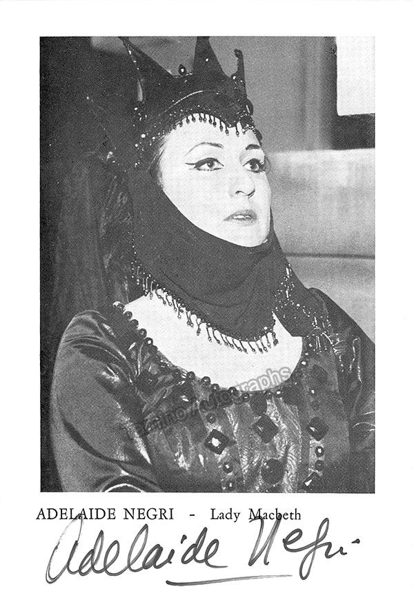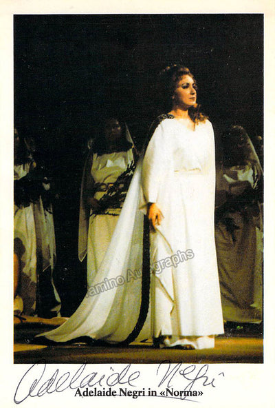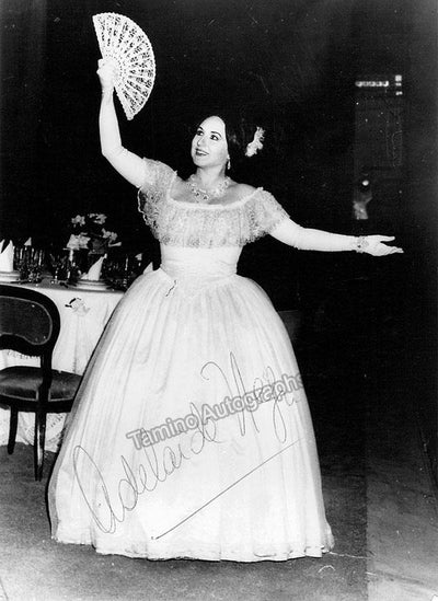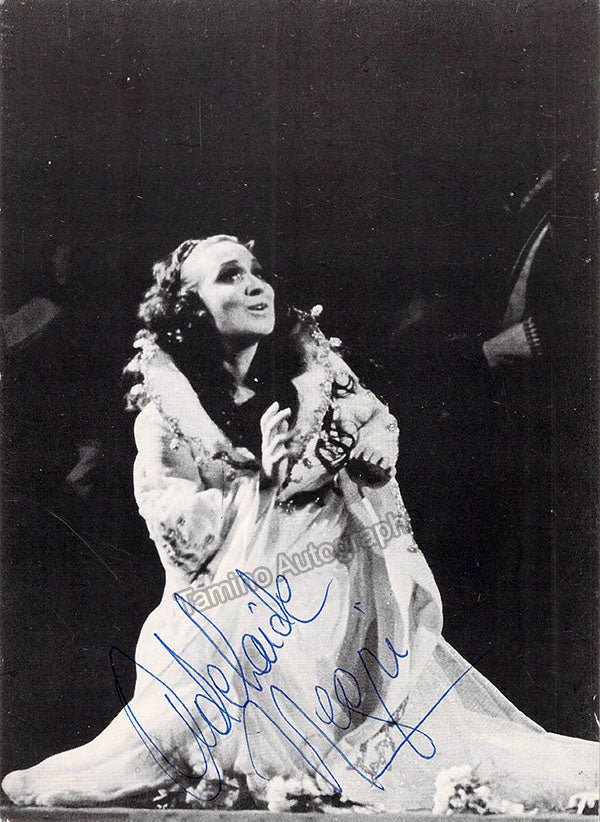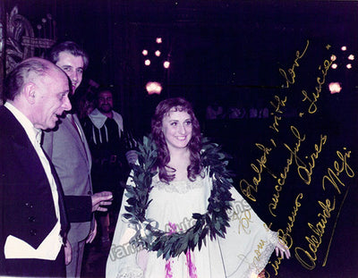 Signed photograph, shown in title role of Donizetti's Lucia di Lammermoor during a curtain call with colleagues, inscribed in Buenos Aires and signed in attractive gold ink. Additional extensive inscription with sentiment on verso, dated in Buenos Aires in 1984, with additional signature only as 'Adelaide'.Size is 8 x 10.25 inches, in excellent condition.