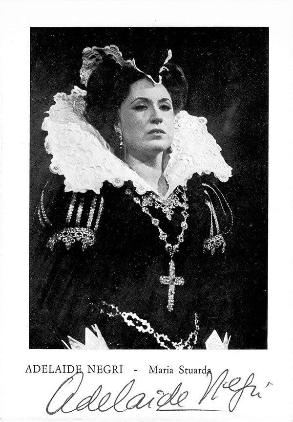 Signed photograph, shown in title role of Donizetti's Maria Stuarda. Size is 4 x 6 inches, in excellent condition.