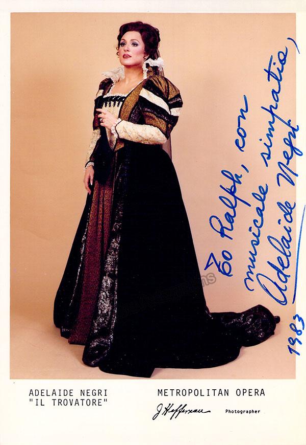 Signed photo, shown as Leonora in Verdi's Il Trovatore, inscribed and dated in 1983. Photo by James Heffernan, Metropolitan Opera, New York. Size is 5 x 7 inches, in excellent condition.