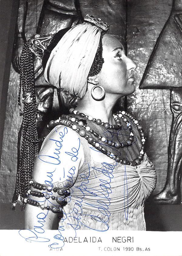 Signed photo, shown in title role of Verdi's Aida at the Teatro Colon, Buenos Aires, inscribed. Size is 5 x 7 inches, in excellent condition.
