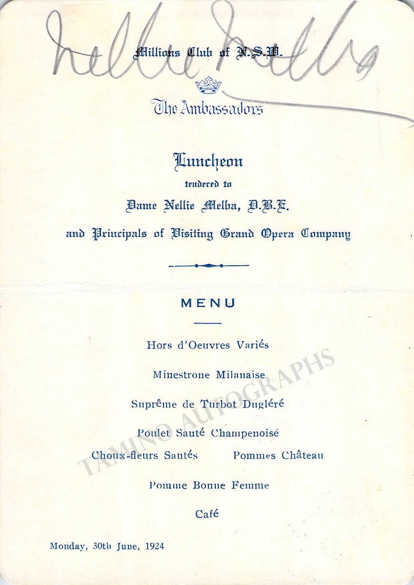 Menu for a lunch in her honor in 1924 at The Ambassadors Cafe, on June 30th, 1924, Australia, signed by her. Size is 4.8 x 6.9 inches, 1 piece of cardboard, central fold, in very good condition.