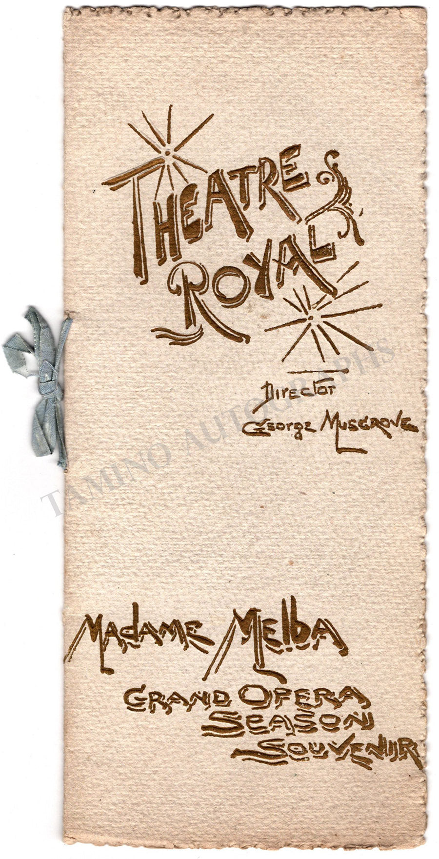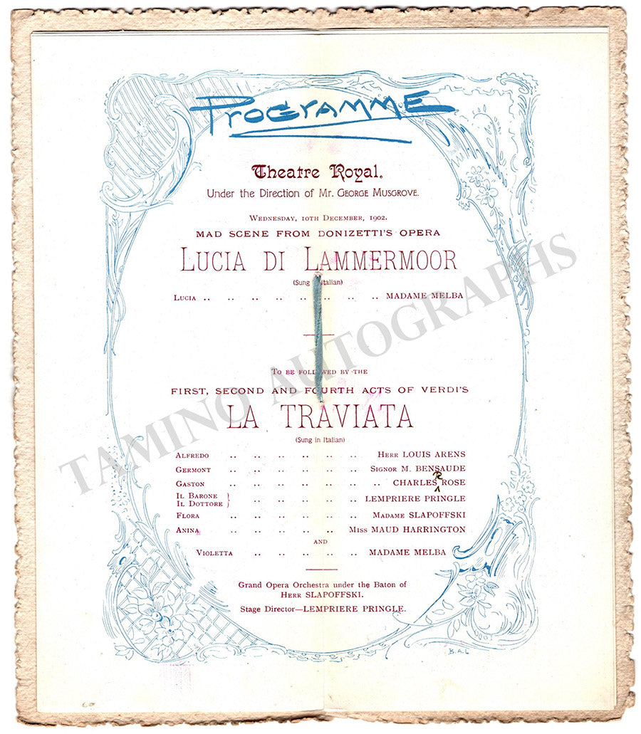 Program for a special concert of the star soprano performing the mad scene from Lucia di Lammermoor and acts 1,2, and 4 from La Traviata at Theatre Royal, Sidney, Australia on December 10th, 1902, under the baton of George Musgrove.