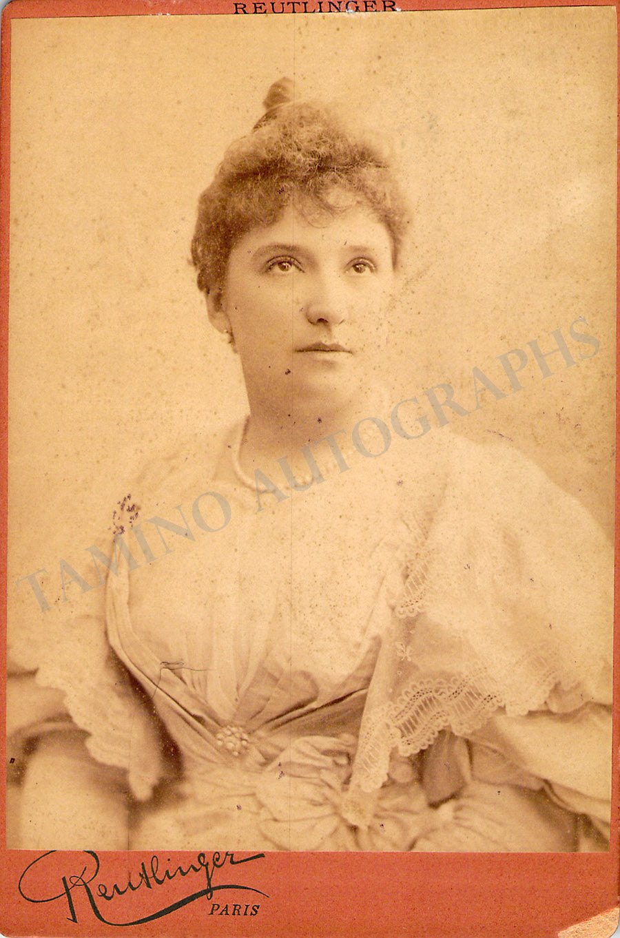 Fine vintage cabinet photograph of her (unsigned) by photographer Charles Reutlinger (Paris). Size is 4.25 x 6.4 inches, minor damage over the lower-right corner, in very good condition.