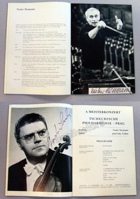Signed pictures (VN conducting & JS portrait with violin) 21 x 15 cm in program. Czech Philharmonic in Nurnberg. 18. November 1973. Zelenka, Beethoven violin concerto, Dvorak Symphony No. 9. 21 x 15 cm.