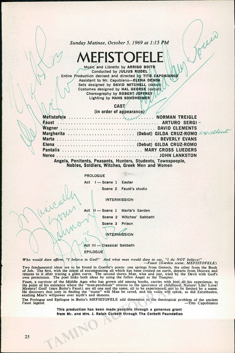 Cast page from a performance of Boito's Mefistofele in 1969, signed by the three above mentioned singers.