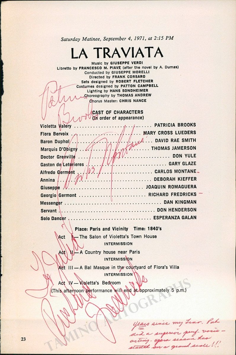 Cast page from a performance of La Traviata (Verdi) in 1971, signed by the three above mentioned singers. Ink writings at the bottom.