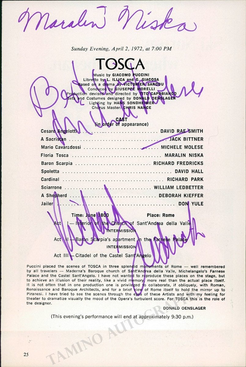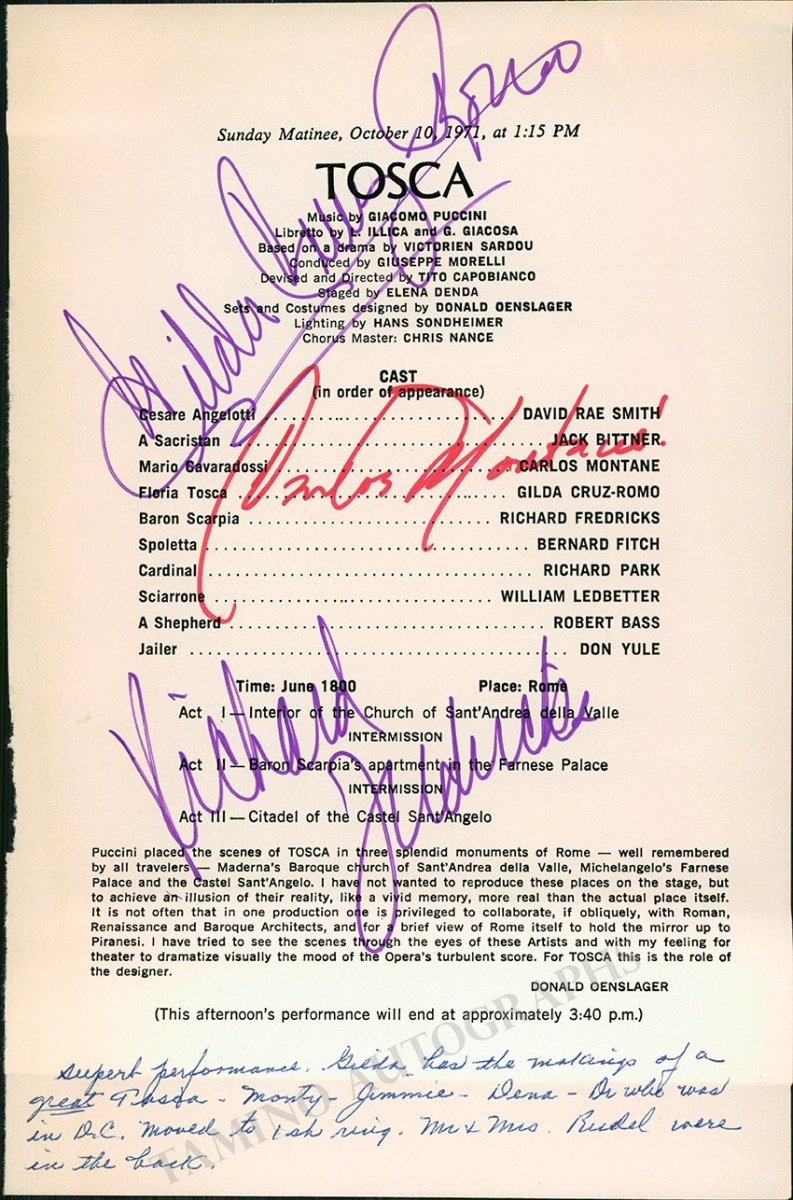 Cast page from a performance of Puccini's Tosca in 1971, signed by the three above mentioned singers.