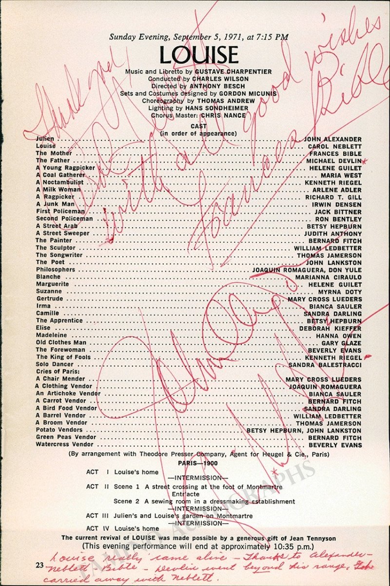 Cast page from a performance of Charpentier's Louise in 1971, signed by the three above mentioned singers plus Frances Bible.