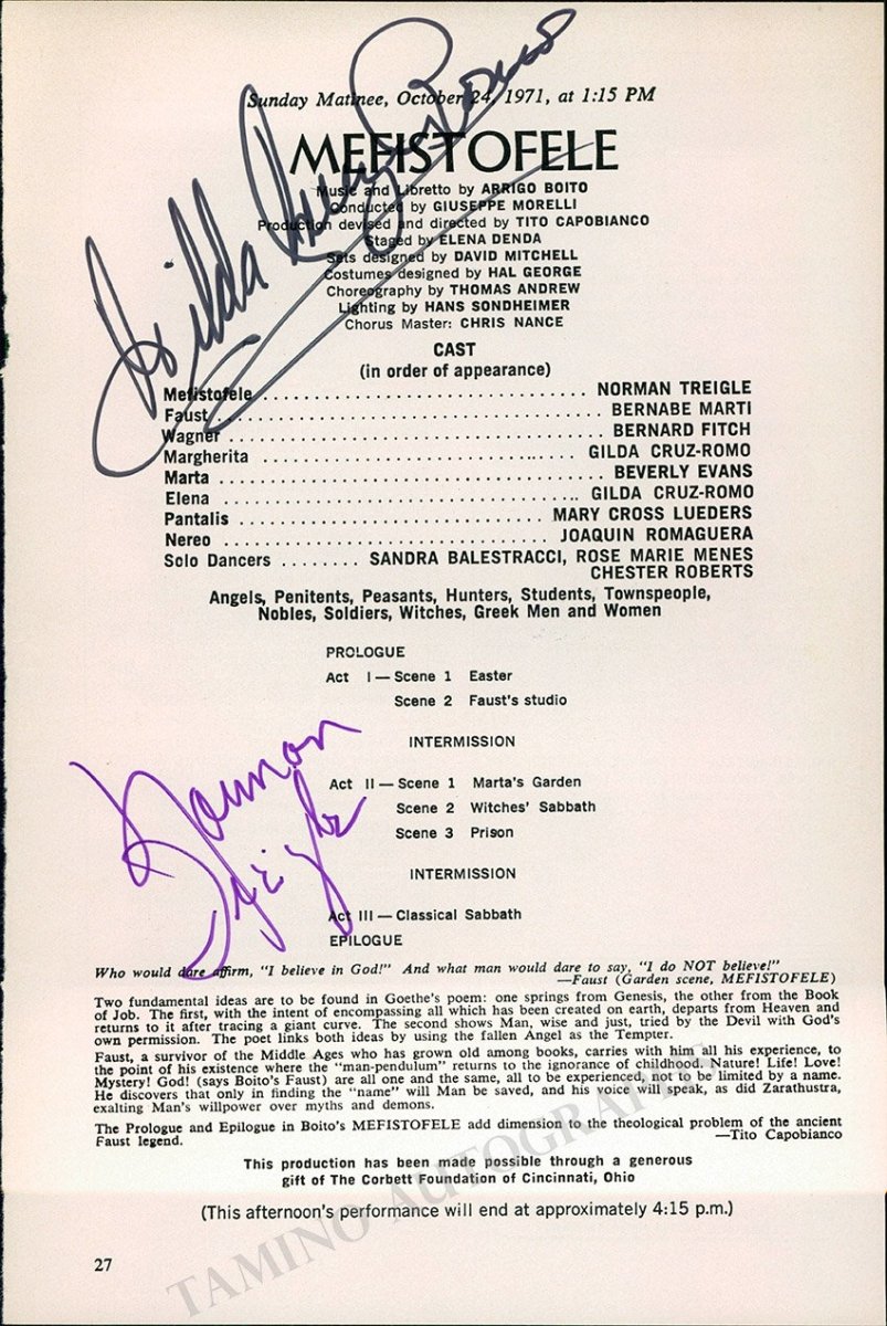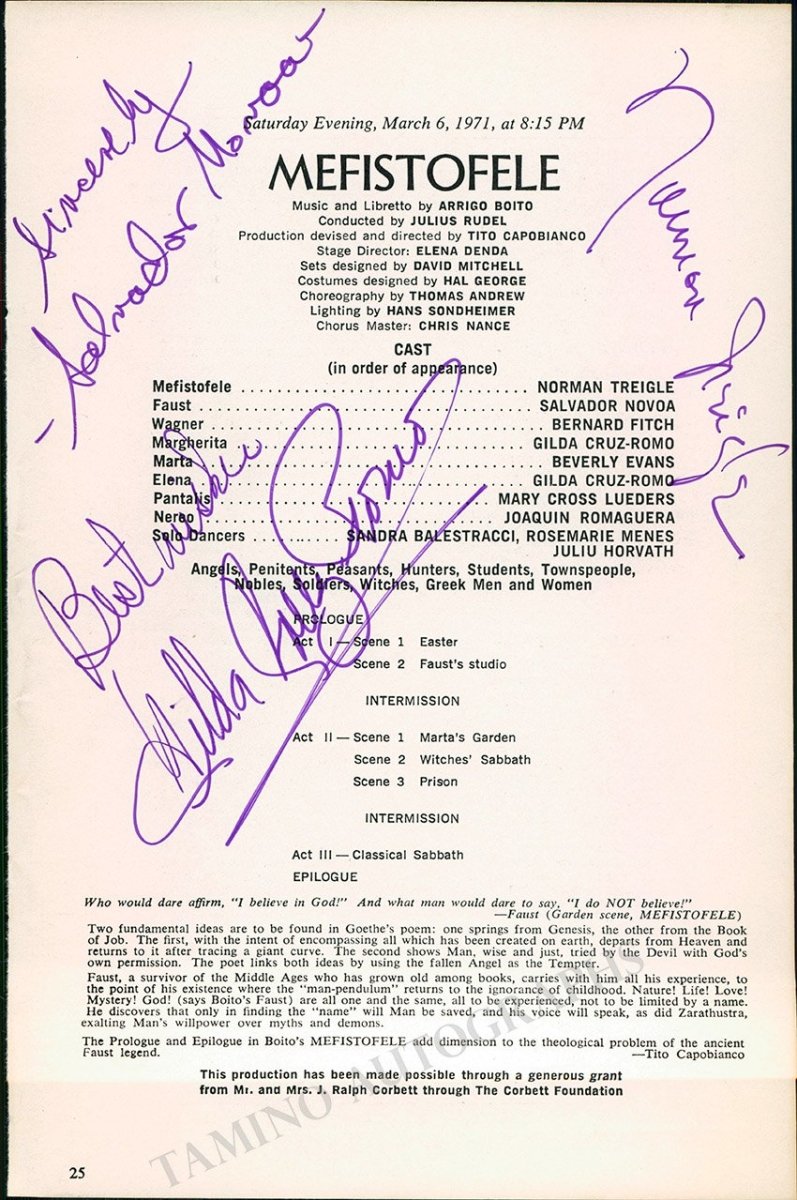 Cast page from a performance of Boito's Mefistofele in 1971, signed by the three above mentioned singers.